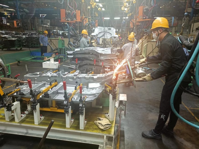 學(xué)生在海南海馬汽車有限公司焊接生產(chǎn)崗位學(xué)習(xí)(工信學(xué)院供圖)