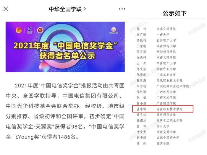 我校學(xué)子榮獲“中國(guó)電信獎(jiǎng)學(xué)金·天翼獎(jiǎng)”